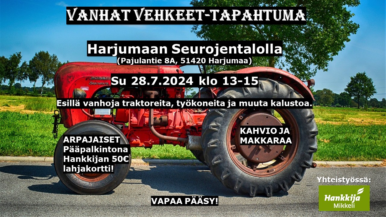 Harjumaan Seurojentalolla vietetään heinäkuun viimeisenä sunnuntaina eli 28.7. kello 13-15 mukavaa koko perheen tapahtumaa. Tapahtumaan voi tuoda näytille vanhaa konekalustoa traktorista mopediin tai vanhaan polkupyörään ja kaikenlaista härveliä menneisyydestä.